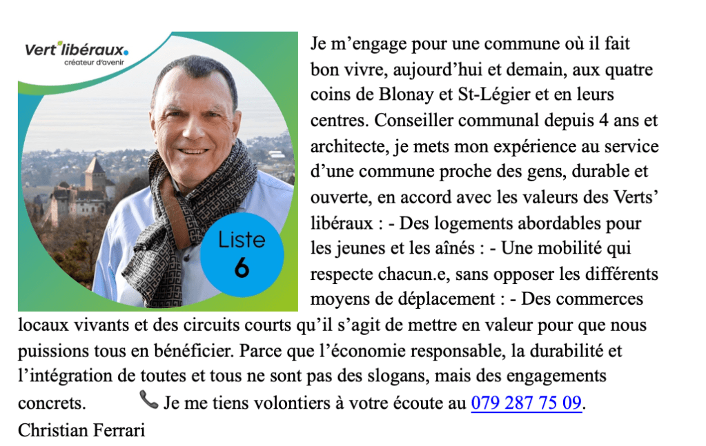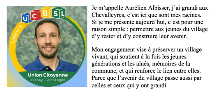 Madame Sarah Lisé pour Les Verts, (Municipale sortante) Monsieur Stéphane Krebs, sans parti (ancien Conseiller Communal, ancien Président du Conseil communal et Monsieur Eric Boraley pour l’UCBSL